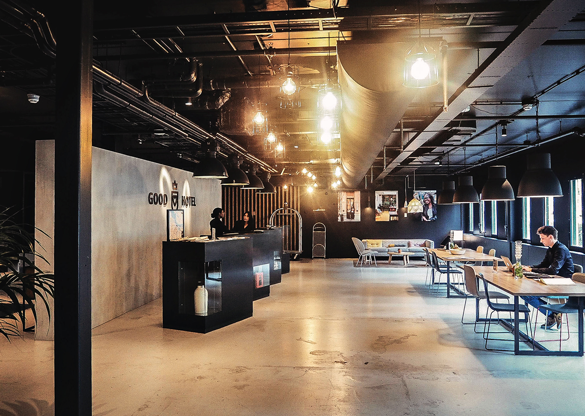 Medan hotellets utsida är grå och intetsägande är insidan rå, edgy, industriell och cool.