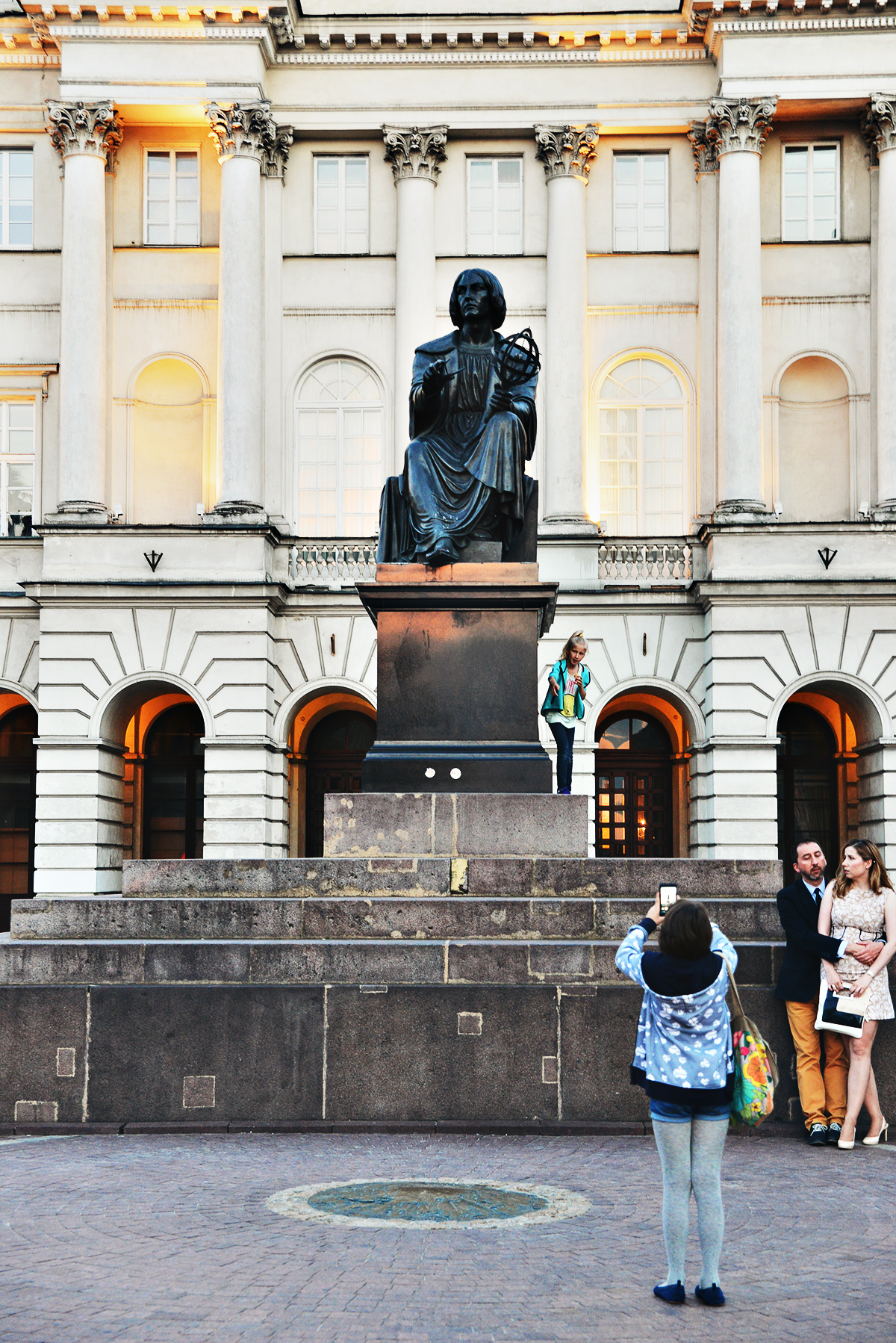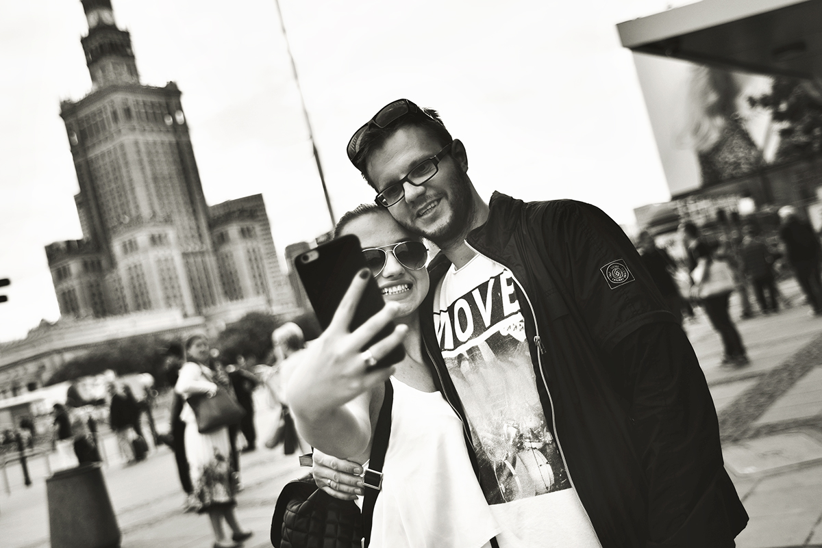 Kasia och Pawel posar för en snabb shoppingselfie innan vi beställer en taxi. I bakgrunden skymtar Kulturpalatset. En magnifik, om än fortfarande något kontroversiell, k-märkt byggnad som ”skänktes” till det polska folket av Stalin (det var ironiskt nog polacker som fick bygga och bekosta byggnaden).