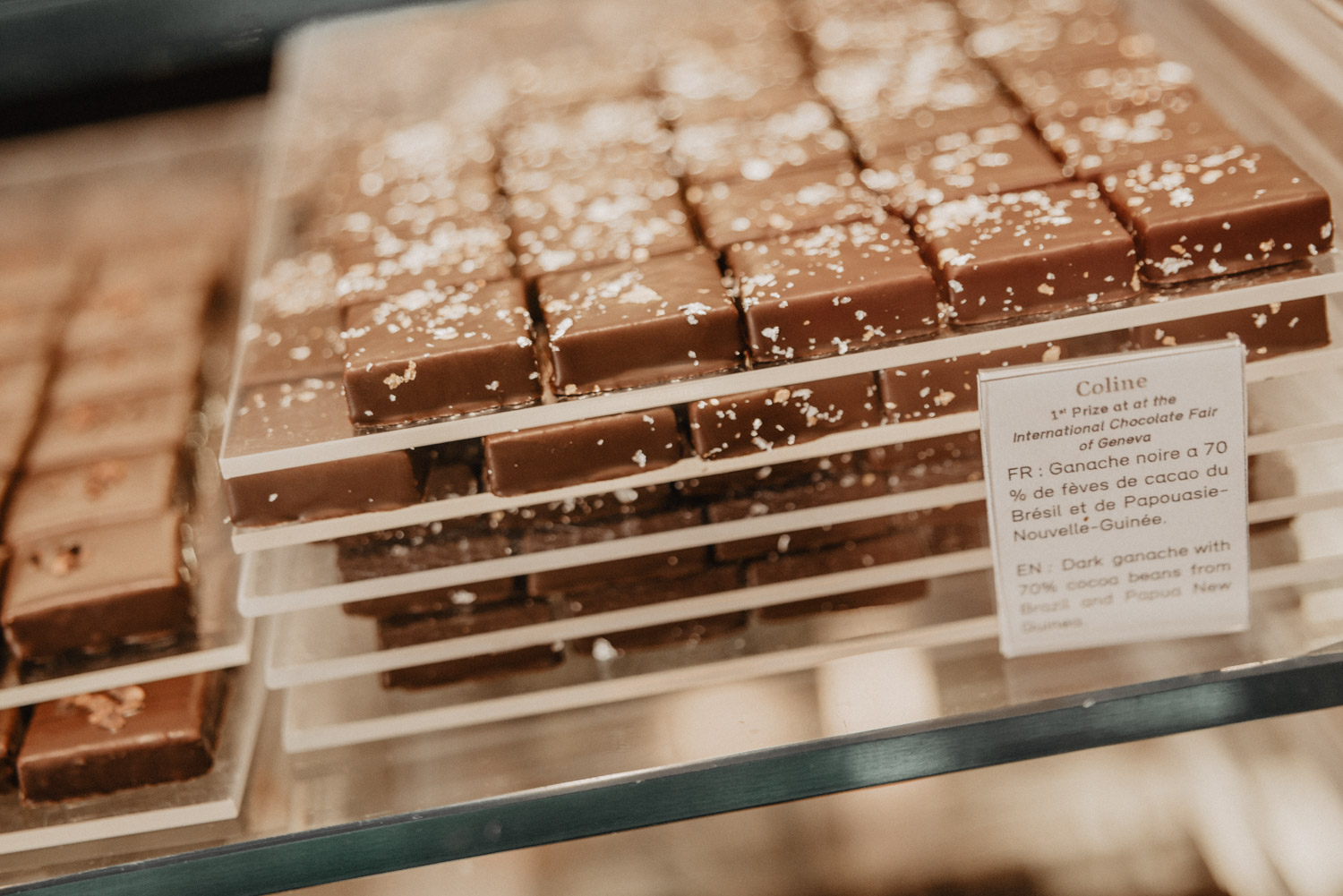 Vi tog en tjuvtitt på övervåningen där chokladen tillverkas innan vi bestämde oss för fyra olika chokladbitar var att prova. Jag hittade en choklad med mitt namn på (bokstavligen!), ”Ida”, som jag bara var tvungen att prova. Det var så gott! Även om min favoritchoklad visade sig vara den redan prisbelönta pralinen kallad ”Coline” – dekorerad med guld och silverflarn.
